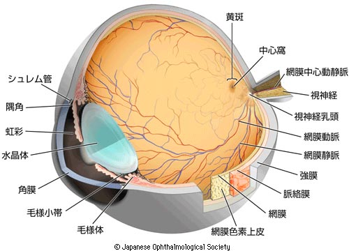 網膜はカメラのフィルムに相当し、外からの光が瞳(瞳孔)、レンズ(水晶体)や目の中央部(硝子体)を通り、網膜に当たり光を感じます。網膜で光が電気信号に変換され脳に伝えられ「見える」のです。
